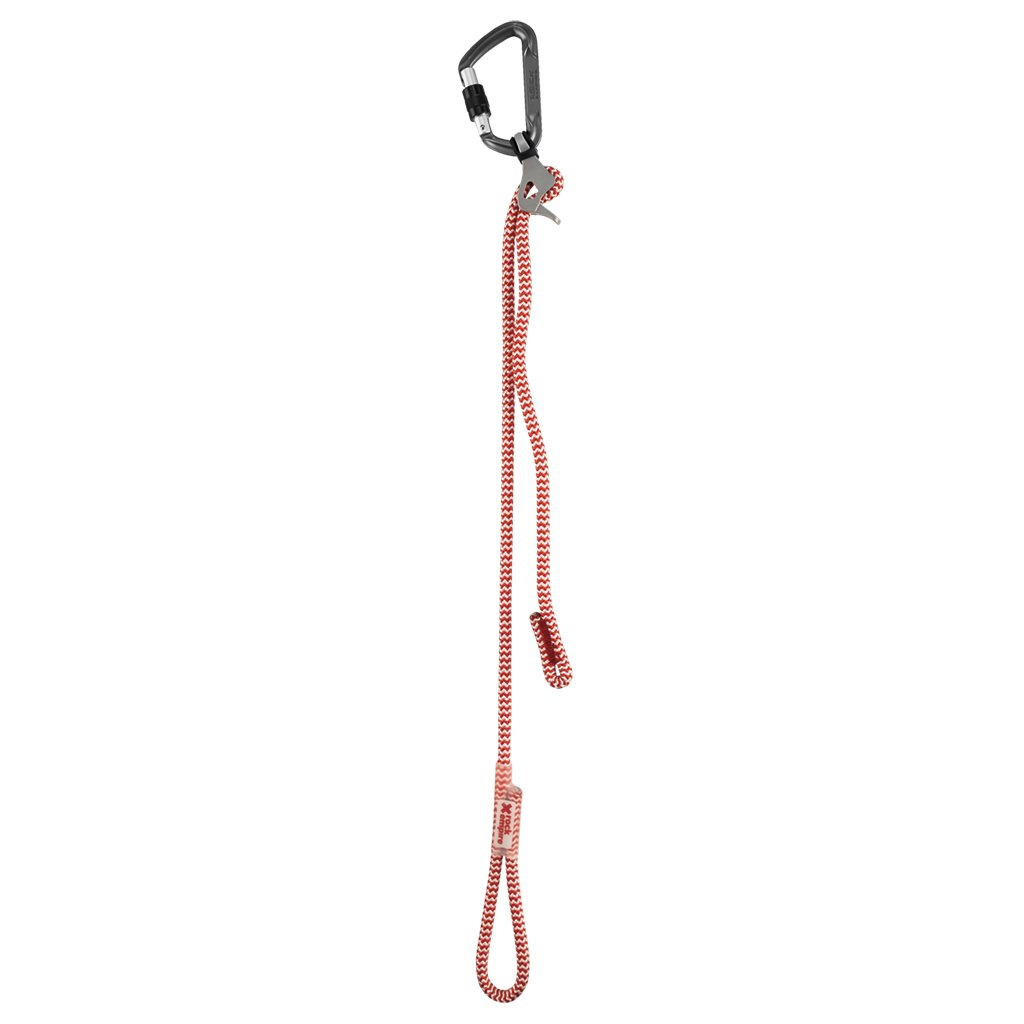 The metal component is made of stainless steel. Its design is unique. It attaches to the tie-in point of the harness with the loop. Once connected, simply pull on the free end of the lanyard to pull towards the anchor or release the tension by holding the device open with the thumb lever.