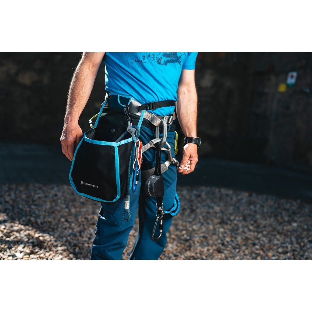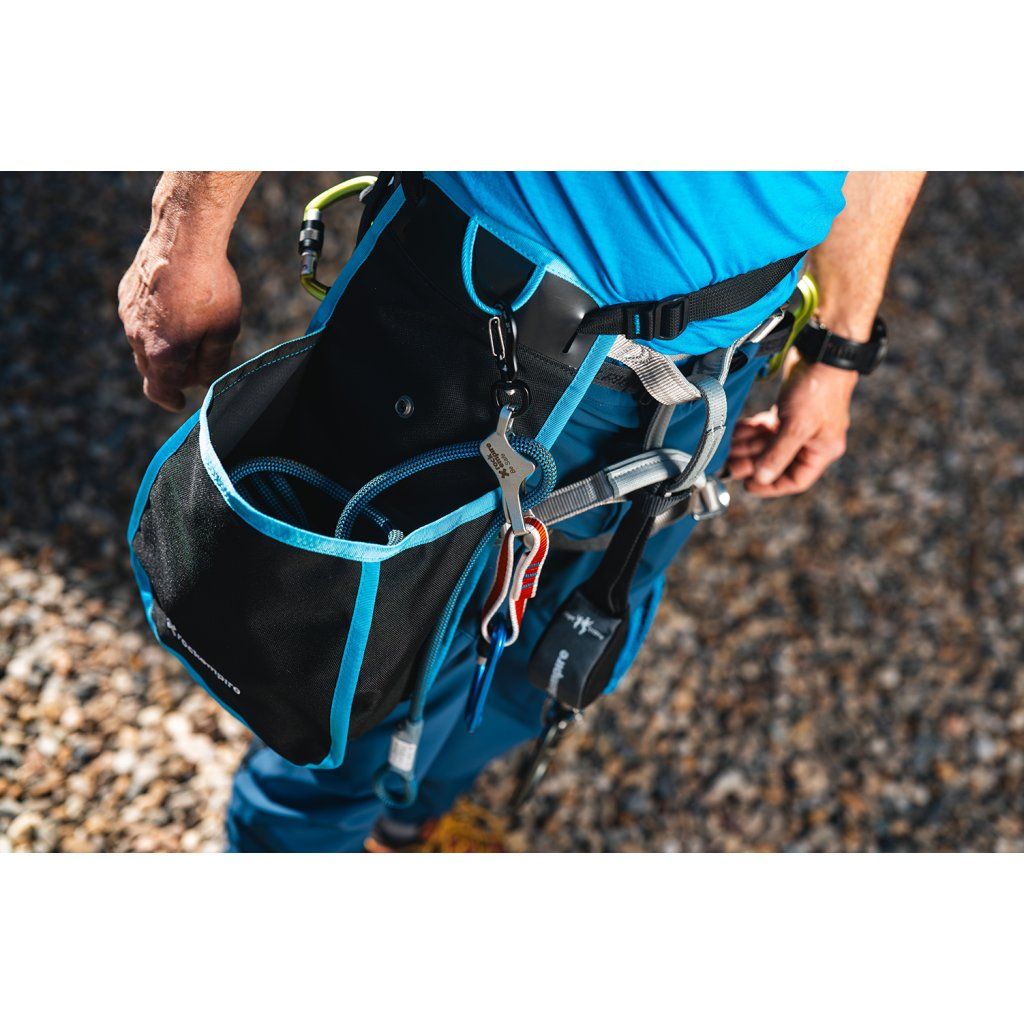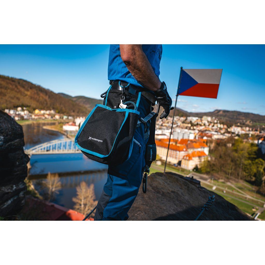 The ergonomic design of the bag is conceived with an emphasis on a firm and stable attachment to the body. The bag has a separate belt and therefore fits very well on the body even during more demanding climbing. Its shape also allows for smooth unspooling of the rope when climbing and then easy insertion of the rope back into the bag while the lower climber is climbing up. An integral part of the bag is also a distinctive label with safety instructions.