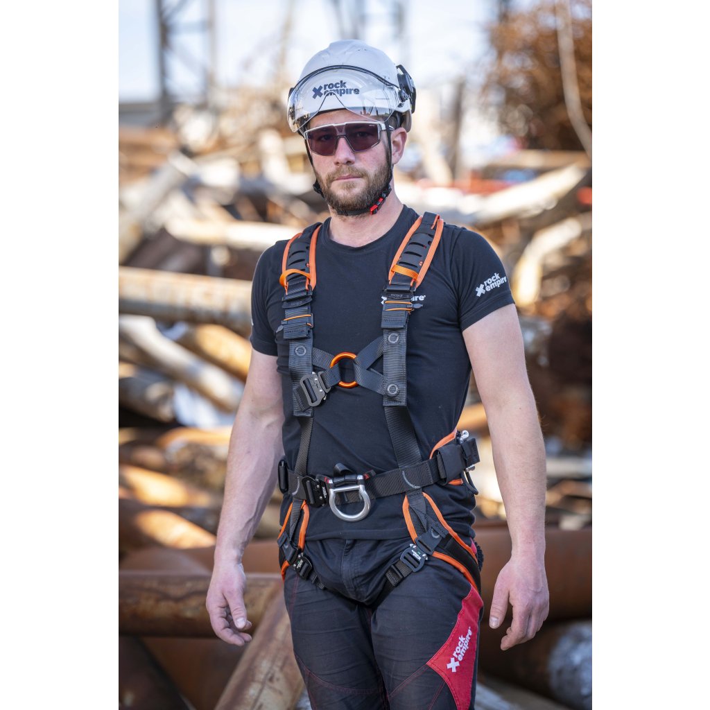 Unlike similar harnesses from other manufacturers, the front attachment point (EN 361) is not divided into two parts, but consists of a single aluminum ring. This minimizes the risk of incorrect connection.